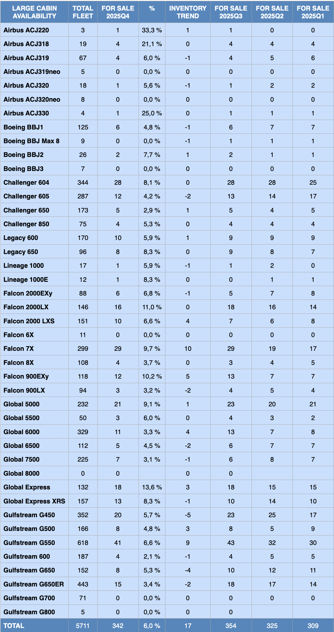 | Global 6500 | 86 | 6 | 7,0% | 1 | 5 | 5 | 3 |